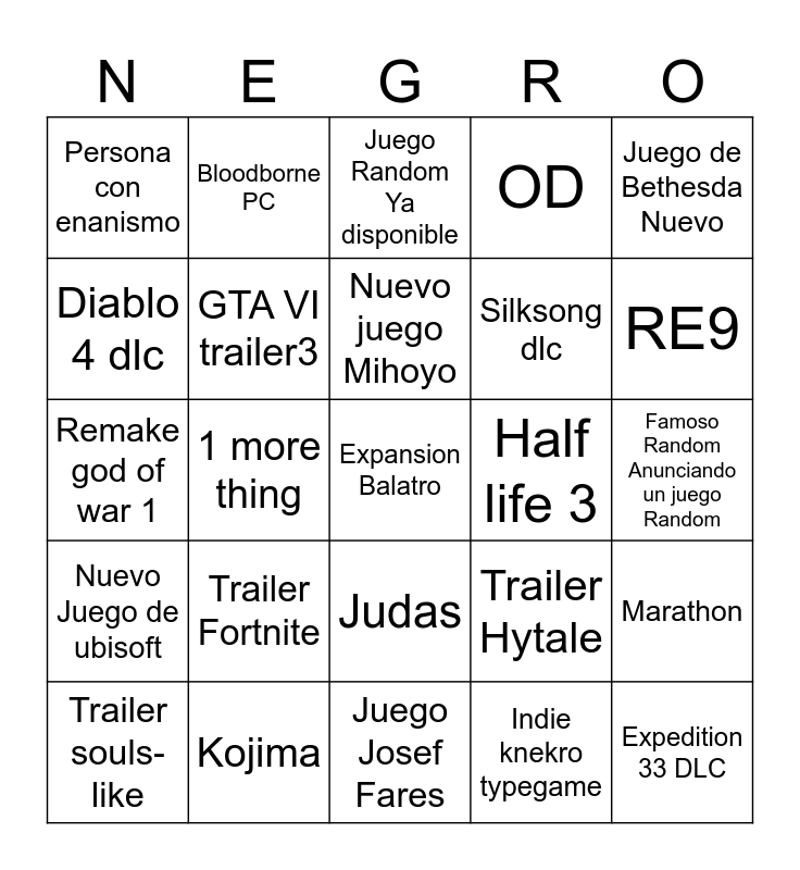 This bingo card has a free space and 24 words: Trailer Fortnite, Kojima, Nuevo juego Mihoyo, Trailer souls-like, Juego de Bethesda Nuevo, Persona con enanismo, Diablo 4 dlc, Bloodborne PC, Half life 3, Judas, Silksong dlc, Remake god of war 1, Trailer Hytale, Marathon, GTA VI trailer3, Indie knekro typegame, Famoso Random Anunciando un juego Random, Juego Random Ya disponible, RE9, 1 more thing, Expedition 33 DLC, Nuevo Juego de ubisoft, OD and Juego Josef Fares.