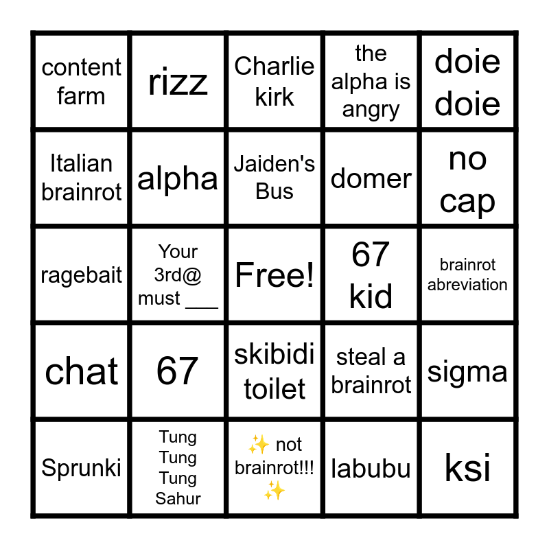 This bingo card has a free space and 24 words: 67, Tung Tung Tung Sahur, Jaiden's Bus, Sprunki, doie doie, content farm, Italian brainrot, rizz, 67 kid, skibidi toilet, domer, ragebait, steal a brainrot, sigma, alpha, labubu, brainrot abreviation, Charlie kirk, no cap, Your 3rd@ must ___, ksi, chat, the alpha is angry and ✨ not brainrot!!! ✨.