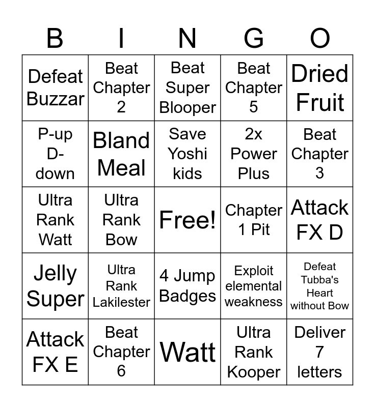 This bingo card has a free space and 99 words: Defeat Lantern Ghost, Power and mega Rush badges, Slot Machine win, Beat Super Blooper, Defeat General Guy without breaking bulb, Bombette, Defeat Huff without Laki, Buy 8 Rip cheato items, 20 star peices, 3x FP plus, 3x HP plus, Bow, Goombario, 4 Jump Badges, All Quake hammer Badges, Defeat Buzzar, Beat Chapter 2, Beat Chapter 4, Ultra Rank Bombette, Ultra Rank Goombario, Parakarry, Hand in 3 Sidequest items, Defeat Master 1, Defeat Anti-guy, Ultra rank 3 partners, Defeat Tubba's Heart without Bow, Save Yoshi kids, Beat 5 enemies in one encounter, Kill a Firebar, All Chomp Room items, Watt, Ultra Rank Kooper, Kooper, Ultra Rank Parakarry, Ultra Rank Bow, Ultra Rank Watt, Sushie, Ultra Rank Sushie, Lakilester, Ultra Rank Lakilester, Beat Chapter 1, Beat Chapter 3, Beat Chapter 5, Beat Chapter 6, Beat Chapter 7, Turn in 5 sidequest items, Turn in 7 sidequest items, Max FP 25+, Max HP 25+, Deliver 3 letters, Deliver 5 letters, Deliver 7 letters, Exploit elemental weakness, Buy every Rip Cheato item, Ultra Boots, Ultra Hammer, Defeat Lakilester, Attack FX C, HeartFinder, Strange Cake, SpinSmash, Crystal Berry, D-down Pound, Dizzy Stomp, Artifact, Dried Fruit, Iced Potato, 2x Damage Dodge, 2x Happy Heart, Jelly Super, Fourth-Degree Card, 2x Power Plus, P-up D-down, Quick Change, Hot Shroom, MultiBounce, Bland Meal, Honey Ultra, Money Money and Refund, Moles, Chapter 1 Pit, Chapter 2 pit (pokey fights), Melon, Magical Bean, Find Every Partner, Ultra Rank Every Partner, Attack FX A, Attack FX B, Attack FX D, Attack FX E, All 5 Attack FX badges, Receive Snowman's Gifts, Block a Monstar attack, Mystery note and Dictonary, Special Shake, Defeat a hurt plant, Get 3 Merlows Rewards, Get all Merlows Rewards and Vase.