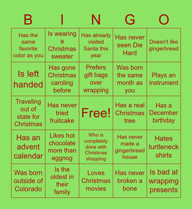 This bingo card has a free space and 24 words: Likes hot chocolate more than eggnog, Is the oldest in their family, Prefers gift bags over wrapping, Was born outside of Colorado, Doesn't like gingerbread, Has the same favorite color as you, Is left handed, Is wearing a Christmas sweater, Has a real Christmas tree, Who is completely done with Christmas shopping, Was born the same month as you, Traveling out of state for Christmas, Has never made a gingerbread house, Hates turtleneck shirts, Has gone Christmas caroling before, Has never broken a bone, Has a December birthday, Has already visited Santa this year, Plays an instrument, Has never tried fruitcake, Is bad at wrapping presents, Has an advent calendar, Has never seen Die Hard and Loves Christmas movies.
