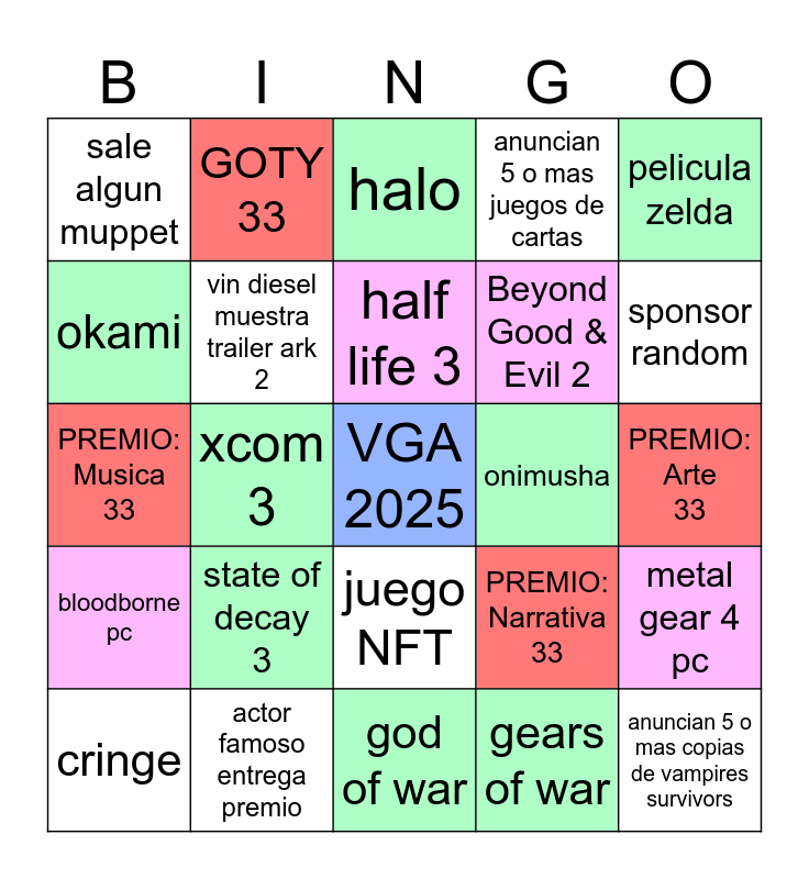 This bingo card has a free space and 24 words: state of decay 3, actor famoso entrega premio, half life 3, cringe, pelicula zelda, sale algun muppet, okami, GOTY 33, onimusha, juego NFT, Beyond Good & Evil 2, PREMIO: Musica 33, PREMIO: Narrativa 33, metal gear 4 pc, vin diesel muestra trailer ark 2, gears of war, PREMIO: Arte 33, halo, sponsor random, xcom 3, anuncian 5 o mas copias de vampires survivors, bloodborne pc, anuncian 5 o mas juegos de cartas and god of war.