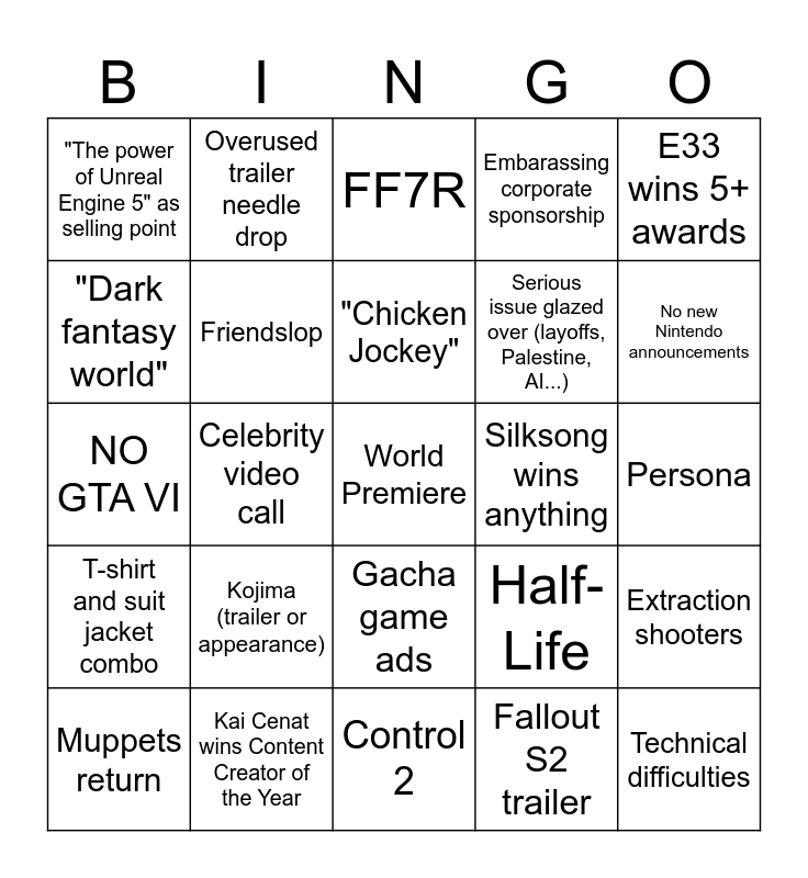 This bingo card has a free space and 24 words: Kojima (trailer or appearance), Kai Cenat wins Content Creator of the Year, "Chicken Jockey", Muppets return, E33 wins 5+ awards, "The power of Unreal Engine 5" as selling point, "Dark fantasy world", Overused trailer needle drop, Silksong wins anything, Gacha game ads, Serious issue glazed over (layoffs, Palestine, AI...), NO GTA VI, Half-Life, Extraction shooters, Friendslop, Fallout S2 trailer, Persona, FF7R, No new Nintendo announcements, Celebrity video call, Technical difficulties, T-shirt and suit jacket combo, Embarassing corporate sponsorship and Control 2.