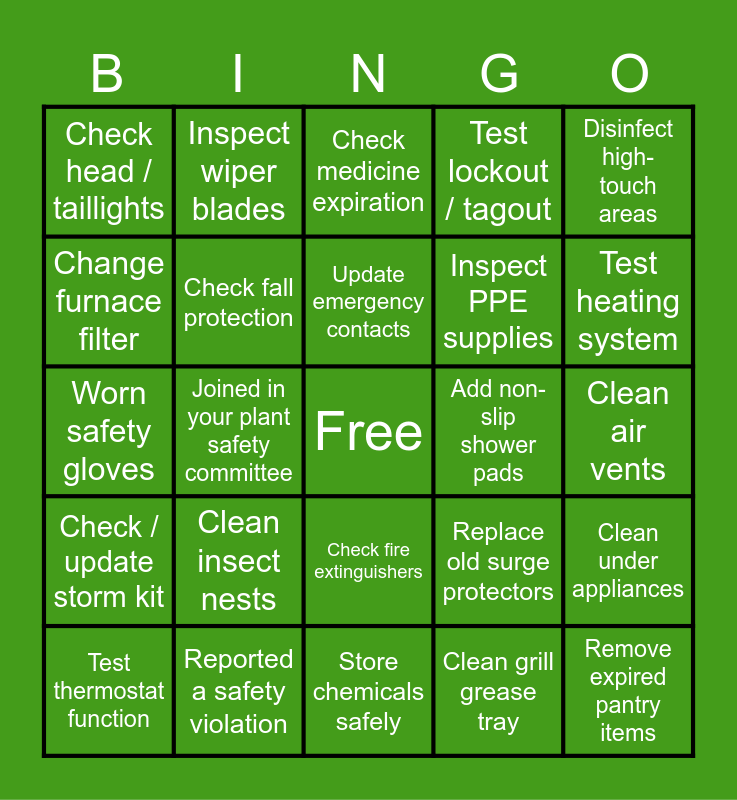 This bingo card has a free space and 86 words: Change fire alarm batteries, Test smoke detectors, Check fire extinguishers, Clean dryer vent, Review fire escape plan, Test security system, Test CO detectors, Test CO detectors, Replace first aid kit materials, Clean house gutters, Lock meds and cleaners, Replace worn doormats, Clean under appliances, Clean air vents, Vacuum / clean refrigerator, Update emergency contacts, Fire extinguisher replacement, Wrap exterior pipes, Clear snow/ice paths, Restock ice melt, Clean fireplace / chimney, Worn safety glasses, Worn safety gloves, Check grill connections, Clean grill grease tray, Remind someone of PPE, Brought up a safety concern, Read an instruction manual before starting, Inspected machinery / tool before use, Had a conversation surrounding safety, Reported a safety violation, Worn noise protection, Trim tree branches, Clean insect nests, Change furnace filter, Bought or worn slip-resistant shoes, Test heating system, Shut off exterior water, Sharpen dull knives, Joined in your plant safety committee, Clean stove drip pans, Deep-clean microwave, Check fridge temps, Add non-slip shower pads, Check fan ventilation, Disinfect high-touch areas, Check tire pressure, Inspect wiper blades, Restock car emergency kit, Test car battery, Check car fluid levels, Check spare tire in your car, Check / update storm kit, Check emergency flashlight batteries, Apply sunscreen in the heat, Review evacuation map, Clear walkway clutter, Inspect PPE supplies, Test lockout / tagout, Check fall protection, Check head / taillights, Clean backup camera on car / machine, Test / get doorbell camera, Replace broken / out lightbulbs, Declutter garage walkways, Check medicine expiration, Verify propane tank date / connection, Remove expired pantry items, Clean behind the dryer, Check exterior deadbolts / replace locks, Replace fridge water filter, Inspect plumbing under sinks, Test thermostat function, Hydration plan for work outside (drink enough water), Stretch before vigorous activity, Store chemicals safely, Store chemicals safely, Install safety gates, Cover unused outlets, Gun safety review with family, Test sump pump, Review emergency supplies, Back up family files, Inspect / buy new lawn tools, Replace old surge protectors and Review household safety roles.