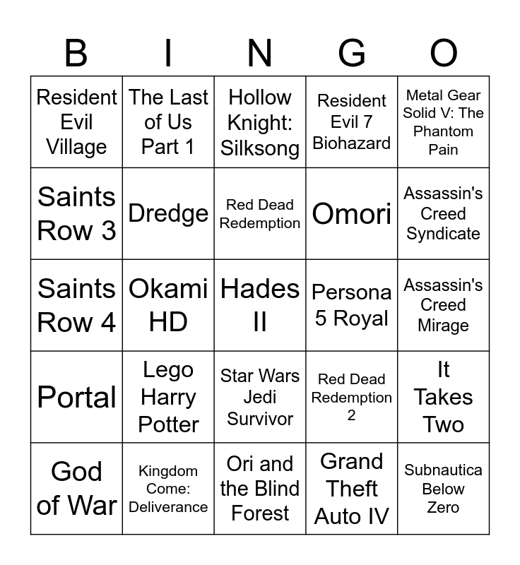 This bingo card has 25 words: Lego Harry Potter, Ori and the Blind Forest, Red Dead Redemption, God of War, Metal Gear Solid V: The Phantom Pain, Resident Evil Village, Saints Row 3, The Last of Us Part 1, Persona 5 Royal, Star Wars Jedi Survivor, Omori, Saints Row 4, Red Dead Redemption 2, It Takes Two, Dredge, Subnautica Below Zero, Assassin's Creed Mirage, Hollow Knight: Silksong, Assassin's Creed Syndicate, Okami HD, Hades II, Kingdom Come: Deliverance, Portal, Resident Evil 7 Biohazard and Grand Theft Auto IV.