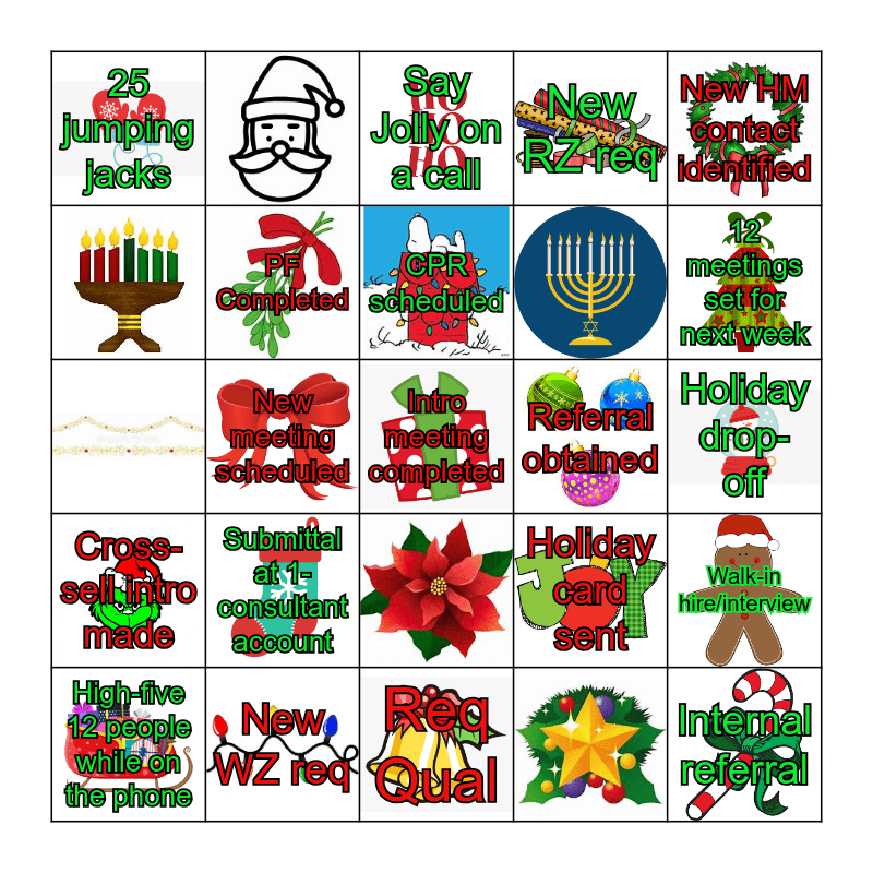 This bingo card has 35 images and 25 words: Google Review, Extension submitted, Merit increase submitted, PF Completed, Holiday card sent, Cross-sell intro made, CPR scheduled, Say Ho, Ho, Ho on a call, New HM contact identified, Interview → GTW same day, New meeting scheduled, New RZ req, Free, Referral obtained, 12 meetings set for next week, 25 jumping jacks, Internal referral, Submittal at 1-consultant account, Intro meeting completed, Say Jolly on a call, Holiday drop-off, Walk-in hire/interview, New WZ req, High-five 12 people while on the phone and Req Qual.