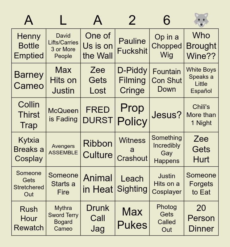 This bingo card has 36 words: Kytxia Breaks a Cosplay, Avengers ASSEMBLE, Drunk Call Jag, D-Piddy Filming Cringe, Jesus?, Chili's More than 1 Night, Henny Bottle Emptied, Mythra Sword Terry Bogard Cameo, One of Us is on the Wall, Leach Sighting, Fountain Con Shut Down, Who Brought Wine??, Someone Gets Stretchered Out, McQueen is Fading, Zee Gets Lost, Pauline Fuckshit, Justin Hits on a Cosplayer, Zee Gets Hurt, Barney Cameo, Max Hits on Justin, Ribbon Culture, Witness a Crashout, Something Incredibly Gay Happens, Someone Forgets to Eat, Collin Thirst Trap, David Lifts/Carries 3 or More People, FRED DURST, Max Pukes, Op in a Chopped Wig, White Boys Speaks a Little Español, Rush Hour Rewatch, Someone Starts a Fire, Animal in Heat, Prop Policy, Photog Gets Called Out and 20 Person Dinner.