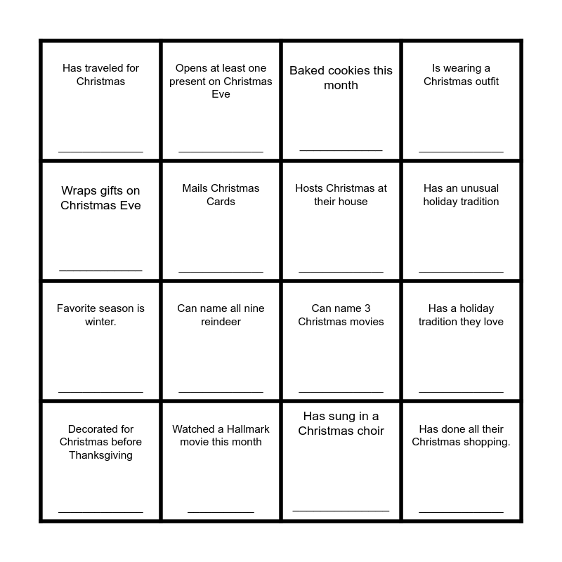 This bingo card has 20 words: Has a holiday tradition they love ______________, Watched a Christmas movie this week ____________, Baked cookies this month ____________, Has a real Christmas tree ____________, Decorated for Christmas before Thanksgiving ______________, Wraps gifts on Christmas Eve ____________, Watched a Hallmark movie this month ___________, Has traveled for Christmas ______________, Favorite season is winter. ______________, Opens at least one present on Christmas Eve ______________, Can name all nine reindeer ______________, Can name 3 Christmas movies ______________, Mails Christmas Cards ______________, Has done all their Christmas shopping. ______________, Hosts Christmas at their house ______________, Watches the same Christmas movie every year ______________, Has an unusual holiday tradition ______________, Is wearing a Christmas outfit ______________, Has sung in a Christmas choir ______________ and Likes Eggnog ______________.