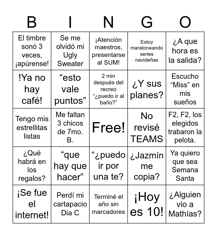 This bingo card has a free space and 28 words: Ya quiero que sea Semana Santa, ¿Ya hiciste Geducar?, ¿Y sus planes?, ¡Hoy es 10!, !Ya no hay café!, ¡Atención maestros, presentarse al SUM!, Se me olvidó mi Ugly Sweater, ¿Qué habrá en los regalos?, No revisé TEAMS, ¡Se fue el internet!, Tengo mis estrellitas listas, Estoy maratoneando series navideñas, Perdí mi cartapacio Dia C, Terminé el año sin marcadores, Escucho “Miss” en mis sueños, Ya tengo la decoración de mi puerta, “que hay que hacer”, “esto vale puntos”, 2 min después del recreo “¿puedo ir al baño?”, “¿puedo ir por una te?, El timbre sonó 3 veces, ¡apúrense!, ¡Keren y Santiago! 6ta calle., ¿Alguien vio a Mathías?, Me faltan 3 chicos de 7mo. B., F2, F2, los elegidos trabaron la pelota., ¿Jazmín me copia?, ¿A que hora es la salida? and Ya quiero que sea Semana Santa.