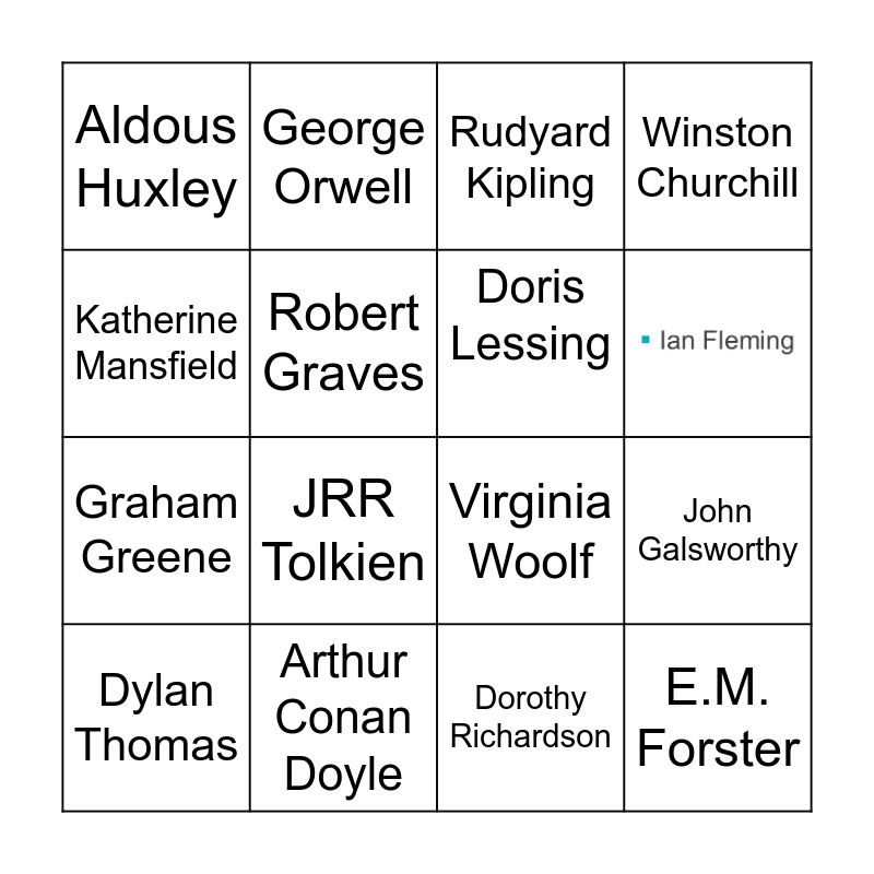 This bingo card has 1 images and 15 words: Arthur Conan Doyle, John Galsworthy, Rudyard Kipling, Aldous Huxley, Graham Greene, George Orwell, Virginia Woolf, Dorothy Richardson, Katherine Mansfield, Robert Graves, Dylan Thomas, Winston Churchill, JRR Tolkien, Doris Lessing and E.M. Forster.