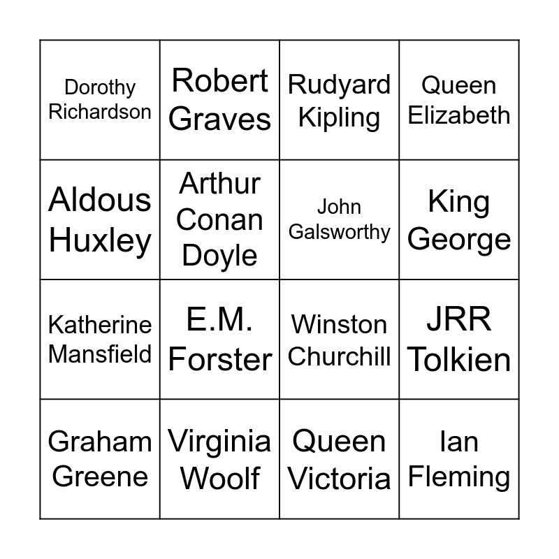 This bingo card has 20 words: JRR Tolkien, Doris Lessing, Rudyard Kipling, George Orwell, Graham Greene, Aldous Huxley, Virginia Woolf, Dorothy Richardson, Katherine Mansfield, Robert Graves, E.M. Forster, Winston Churchill, Arthur Conan Doyle, Ian Fleming, John Galsworthy, Dylan Thomas, King George, Queen Elizabeth, Queen Victoria and JK Rowling.