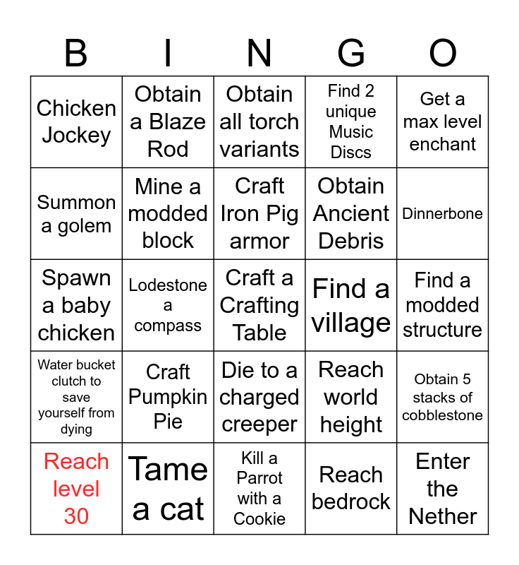 This bingo card has a free space and 50 words: Diamond, Enter the Nether, Craft 32 Chests, Kill a Parrot with a Cookie, Craft Pumpkin Pie, Finding and applying an armor trim, Obtain a Blaze Rod, Make a cake, Summon a golem, Obtain a leaf block, Mine a modded block, Find 2 unique Music Discs, Obtain 5 stacks of cobblestone, Reach world height, Wax copper, Axoltol in a bucket, Craft Iron Pig armor, Find a village, Level up a villager, Get a max level enchant, Lodestone a compass, Reach bedrock, Chicken Jockey, Obtain Ancient Debris, Craft a Netherite Chestplate, Obtain any mob head, Dinnerbone, Break a golden tool, Obtain all torch variants, Die to a charged creeper, Burn in lava while trying to escape a spider, Obtain cut copper stairs, Shoot a fireball back at a ghast, Breed Horse Donkey to Mule, Tame a cat, Craft an Observer, Insult Mineknights in dms at EXACTLY 35 minutes into the run, Obtain 4 different wood types, Craft 2 stacks of doors, Find a modded structure, Unique banner pattern on shield, Obtain a honey bottle, Obtain all furnace types, overcoming survival limitations (Build a 6x6 house with basic needs), Reach level 30, Spawn a baby chicken, Open a vault, Obtain a glow item frame, Water bucket clutch to save yourself from dying and Get poisioned by a pufferfish.