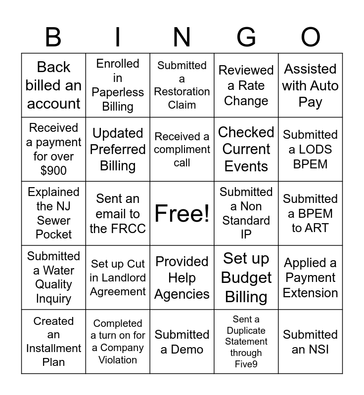 This bingo card has a free space and 24 words: Set up Cut in Landlord Agreement, Completed a turn on for a Company Violation, Received a compliment call, Created an Installment Plan, Assisted with Auto Pay, Back billed an account, Received a payment for over $900, Enrolled in Paperless Billing, Submitted a Non Standard IP, Provided Help Agencies, Checked Current Events, Explained the NJ Sewer Pocket, Set up Budget Billing, Applied a Payment Extension, Updated Preferred Billing, Sent a Duplicate Statement through Five9, Submitted a BPEM to ART, Submitted a Restoration Claim, Submitted a LODS BPEM, Sent an email to the FRCC, Submitted an NSI, Submitted a Water Quality Inquiry, Reviewed a Rate Change and Submitted a Demo.