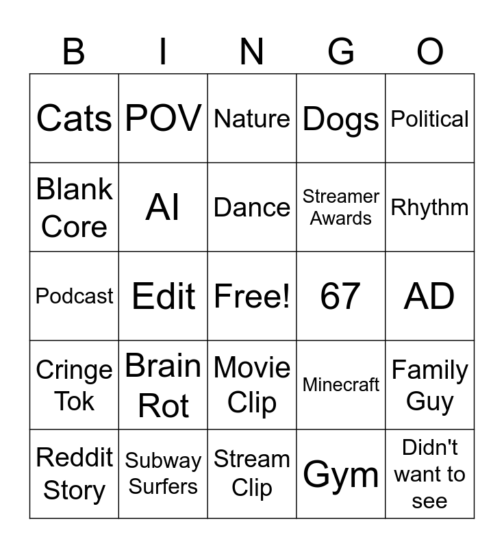 This bingo card has a free space and 24 words: Brain Rot, Subway Surfers, Dance, Reddit Story, Political, Cats, Blank Core, POV, 67, Movie Clip, Streamer Awards, Podcast, Minecraft, Family Guy, AI, Gym, AD, Nature, Rhythm, Edit, Didn't want to see, Cringe Tok, Dogs and Stream Clip.
