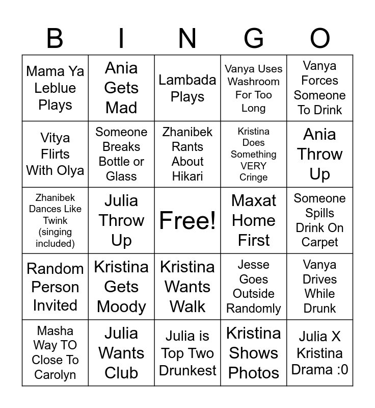 This bingo card has a free space and 24 words: Kristina Gets Moody, Julia Wants Club, Zhanibek Rants About Hikari, Masha Way TO Close To Carolyn, Vanya Forces Someone To Drink, Mama Ya Leblue Plays, Vitya Flirts With Olya, Ania Gets Mad, Maxat Home First, Kristina Wants Walk, Kristina Does Something VERY Cringe, Zhanibek Dances Like Twink (singing included), Jesse Goes Outside Randomly, Vanya Drives While Drunk, Someone Breaks Bottle or Glass, Kristina Shows Photos, Someone Spills Drink On Carpet, Lambada Plays, Ania Throw Up, Julia Throw Up, Julia X Kristina Drama :0, Random Person Invited, Vanya Uses Washroom For Too Long and Julia is Top Two Drunkest.