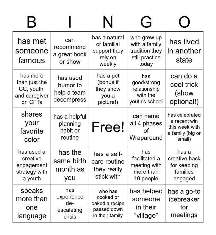 This bingo card has a free space and 24 words: has the same birth month as you, has experience de-escalating crisis, has a pet (bonus if they show you a picture!), speaks more than one language, has lived in another state, has met someone famous, has more than just the CC, youth, and caregiver on CFTs, can recommend a great book or show, can name all 4 phases of Wraparound, has a self-care routine they really stick with, has good/strong relationship with the youth's school, shares your favorite color, has facilitated a meeting with more than 10 people, has a creative hack for keeping families engaged, has used humor to help a team decompress, has helped someone in their “village”, has celebrated a recent win this week with a family (big or small), has a natural or familial support they rely on weekly, can do a cool trick (show optional!), has a helpful planning habit or routine, has a go-to icebreaker for meetings, has used a creative engagement strategy with a youth, who grew up with a family tradition they still practice today and who has cooked or baked a recipe passed down in their family.