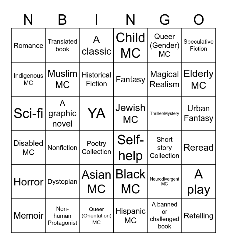 This bingo card has 36 words: Black MC, Asian MC, Hispanic MC, Indigenous MC, Disabled MC, Jewish MC, Muslim MC, Queer (Orientation) MC, Queer (Gender) MC, Neurodivergent MC, Elderly MC, Child MC, A play, A graphic novel, Fantasy, Romance, Horror, Thriller/Mystery, Sci-fi, A classic, YA, Nonfiction, Self-help, Poetry Collection, Short story Collection, Translated book, Magical Realism, Non-human Protagonist, Historical Fiction, Speculative Fiction, Retelling, Memoir, Reread, Urban Fantasy, Dystopian and A banned or challenged book.