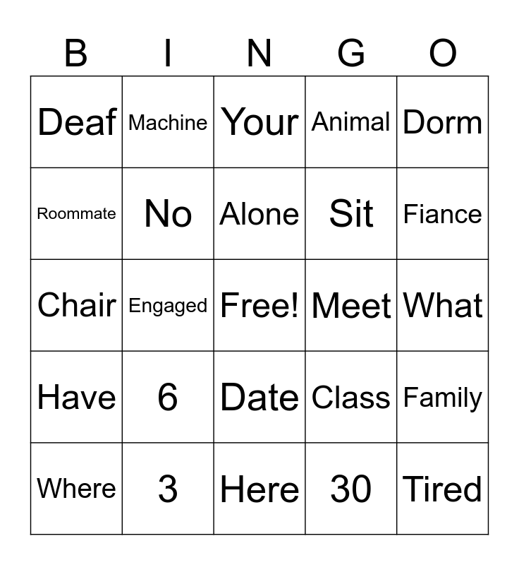 This bingo card has a free space and 24 words: 6, 3, Alone, Where, Dorm, Deaf, Roommate, Machine, Meet, Date, Sit, Chair, Class, Family, No, 30, What, Your, Fiance, Engaged, Tired, Have, Animal and Here.