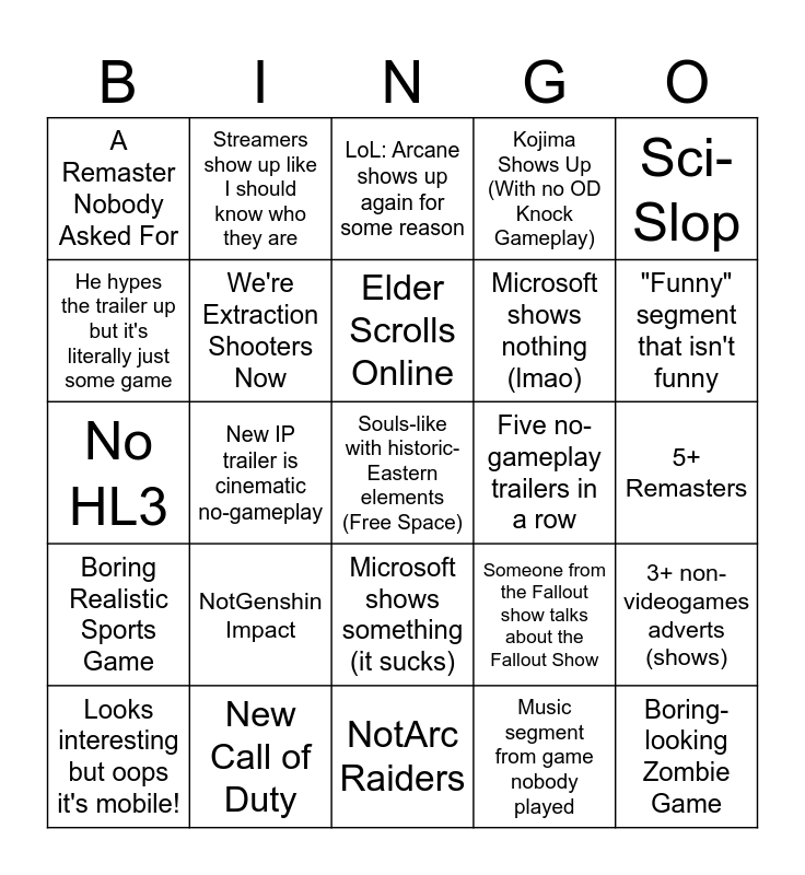 This bingo card has a free space and 24 words: NotGenshin Impact, New Call of Duty, Elder Scrolls Online, Looks interesting but oops it's mobile!, Sci-Slop, A Remaster Nobody Asked For, He hypes the trailer up but it's literally just some game, Streamers show up like I should know who they are, Five no-gameplay trailers in a row, Microsoft shows something (it sucks), Microsoft shows nothing (lmao), No HL3, Someone from the Fallout show talks about the Fallout Show, 3+ non-videogames adverts (shows), We're Extraction Shooters Now, Music segment from game nobody played, 5+ Remasters, LoL: Arcane shows up again for some reason, "Funny" segment that isn't funny, New IP trailer is cinematic no-gameplay, Boring-looking Zombie Game, Boring Realistic Sports Game, Kojima Shows Up (With no OD Knock Gameplay) and NotArc Raiders.