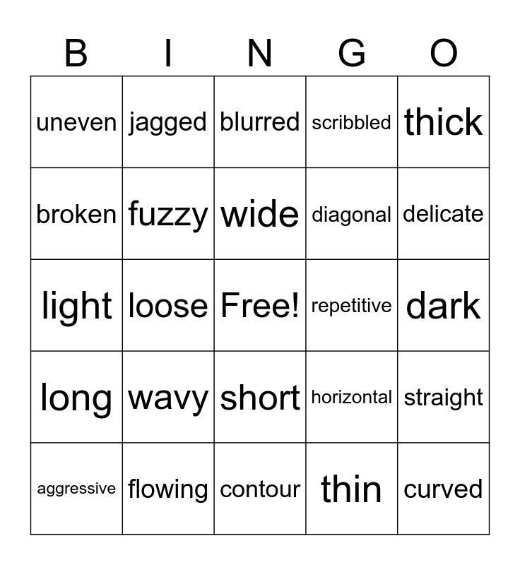 This bingo card has a free space and 27 words: horizontal, vertical, diagonal, contour, broken, blurred, jagged, long, repetitive, straight, light, scribbled, aggressive, flowing, delicate, bold, fuzzy, wide, wavy, uneven, dark, thin, loose, curved, short, thick and dotted.