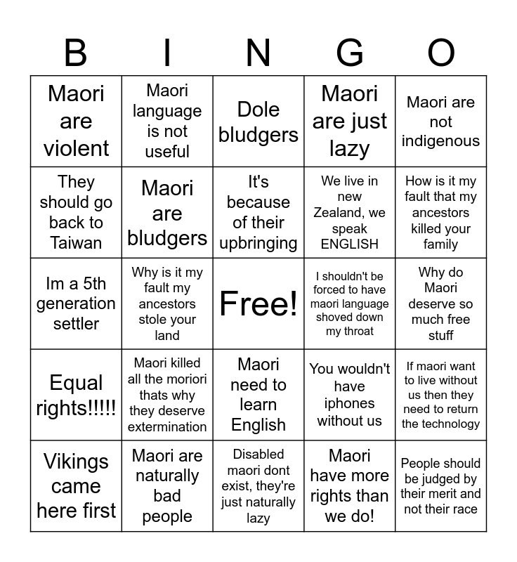 This bingo card has a free space and 24 words: Maori killed all the moriori thats why they deserve extermination, Maori are naturally bad people, It's because of their upbringing, Vikings came here first, Maori are not indigenous, Maori are violent, They should go back to Taiwan, Maori language is not useful, I shouldn't be forced to have maori language shoved down my throat, Maori need to learn English, We live in new Zealand, we speak ENGLISH, Im a 5th generation settler, You wouldn't have iphones without us, If maori want to live without us then they need to return the technology, Maori are bludgers, Maori have more rights than we do!, Why do Maori deserve so much free stuff, Dole bludgers, How is it my fault that my ancestors killed your family, Why is it my fault my ancestors stole your land, People should be judged by their merit and not their race, Equal rights!!!!!, Maori are just lazy and Disabled maori dont exist, they're just naturally lazy.