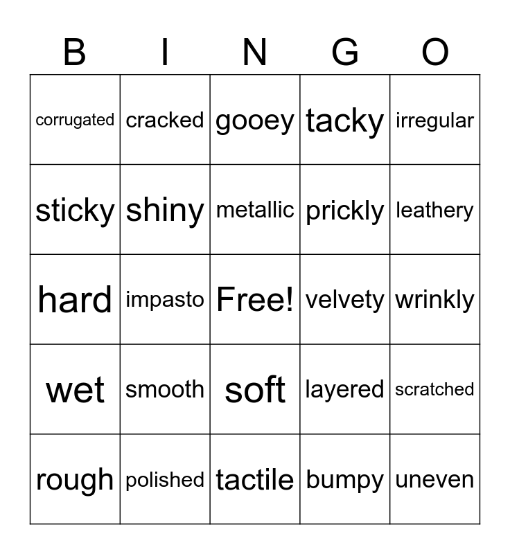 This bingo card has a free space and 29 words: rough, coarse, impasto, flat, corrugated, gooey, shiny, smooth, velvety, polished, wrinkly, uneven, tactile, bumpy, leathery, sandy, soft, wet, irregular, hard, layered, furry, prickly, sticky, tacky, cracked, scratched, metallic and scumbled.