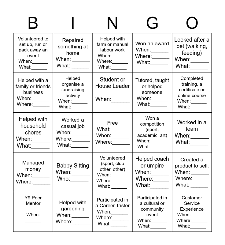 This bingo card has a free space and 24 words: Babby Sitting When:______ Who:______, Helped with gardening When:______ Where:______, Student or House Leader When:______, Y9 Peer Mentor When: ______, Looked after a pet (walking, feeding) When:______ What:______, Volunteered to set up, run or pack away an event When:______ What:______, Helped with a family or friends business When: ______ Where:______, Repaired something at home When: ______ What: ______, Won a competition (sport, academic, art) When: ______ What: ______, Volunteered (sport, club other, other) When: ______ Where: ______ What: ______, Tutored, taught or helped someone When:______ What:______, Helped with household chores When:______ What:______, Helped coach or umpire When:______ Where:_____ What:______, Created a product to sell: When: ______ Where: _____ What: ______, Helped organise a fundraising activity When:______ What:______, Participated in a cultural or community event When:______ What:______, Worked in a team When:______ What:______, Helped with farm or manual labour work When:______ Where:______ What:______, Completed training, a certificate or online course When:______ What:______, Worked a casual job When:______ Where:______ What:______, Customer Service Experience When:______ Where:______ What:______, Managed money When:______ Where:______, Won an award When:______ Where:______ What:______ and Participated in a Career Taster When:______ Where:______ What:______.