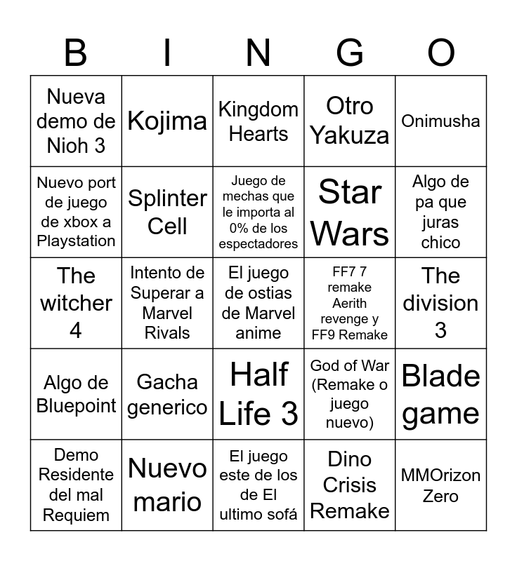 This bingo card has a free space and 24 words: Demo Residente del mal Requiem, Gacha generico, Juego de mechas que le importa al 0% de los espectadores, Dino Crisis Remake, Onimusha, Nueva demo de Nioh 3, Kojima, Kingdom Hearts, FF7 7 remake Aerith revenge y FF9 Remake, The division 3, The witcher 4, Splinter Cell, God of War (Remake o juego nuevo), Blade game, Nuevo port de juego de xbox a Playstation, Nuevo mario, El juego este de los de El ultimo sofá, Otro Yakuza, Algo de pa que juras chico, Algo de Bluepoint, Intento de Superar a Marvel Rivals, Half Life 3, Star Wars and MMOrizon Zero.