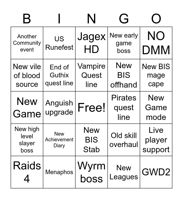 This bingo card has a free space and 24 words: Raids 4, New Achievement Diary, Vampire Quest line, New Leagues, NO DMM, Another Community event, US Runefest, Jagex HD, Pirates quest line, New Game mode, New Game, End of Guthix quest line, Old skill overhaul, Live player support, New vile of blood source, Menaphos, Wyrm boss, New early game boss, New BIS mage cape, New high level slayer boss, Anguish upgrade, New BIS Stab, New BIS offhand and GWD2.