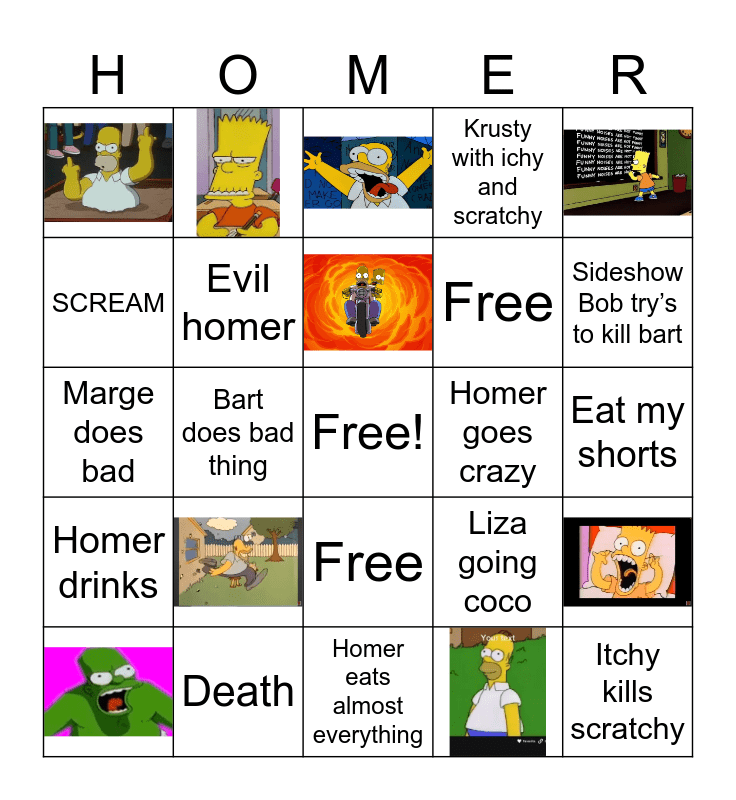 This bingo card has 9 images, a free space and 15 words: Homer goes crazy, Eat my shorts, Marge does bad, Evil homer, Liza going coco, SCREAM, Death, Homer eats almost everything, Krusty with ichy and scratchy, Sideshow Bob try’s to kill bart, Homer drinks, Bart does bad thing, Free, Free and Itchy kills scratchy.