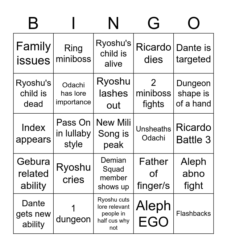 This bingo card has a free space and 24 words: Ryoshu cries, 1 dungeon, Ryoshu lashes out, Dante gets new ability, Dante is targeted, Family issues, Ryoshu's child is dead, Ring miniboss, Unsheaths Odachi, Demian Squad member shows up, 2 miniboss fights, Index appears, Father of finger/s, Aleph abno fight, Odachi has lore importance, Aleph EGO, Ricardo Battle 3, Ryoshu's child is alive, Dungeon shape is of a hand, Pass On in lullaby style, Flashbacks, Gebura related ability, Ricardo dies and Ryoshu cuts lore relevant people in half cus why not.