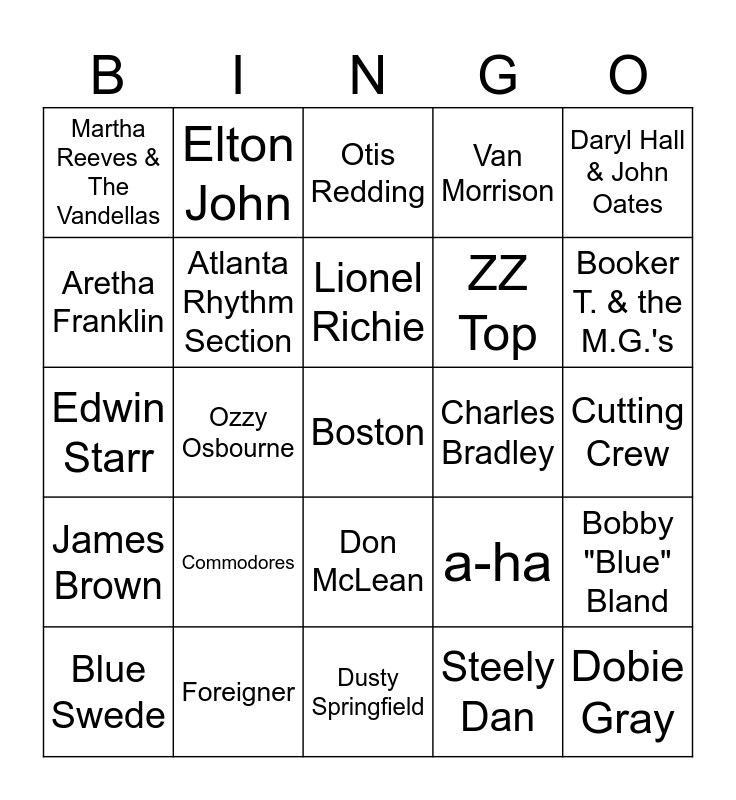 This bingo card has 41 words: Lindsey Buckingham, Edwin Starr, Billy Paul, Atlanta Rhythm Section, Foreigner, Don McLean, Lionel Richie, Chuck Berry, Daryl Hall & John Oates, James Brown, Ozzy Osbourne, Van Morrison, Boston, Cutting Crew, Charles Bradley, Commodores, Crowded House, Martha Reeves & The Vandellas, The Jackson 5, Otis Redding, Bobby "Blue" Bland, Dobie Gray, Dusty Springfield, ZZ Top, Elvis Presley, Orleans, Steely Dan, Bee Gees, Booker T. & the M.G.'s, Etta James, Sam & Dave, Elton John, Blue Swede, Queen, a-ha, Aretha Franklin, Billy Joel, Nina Simone, The Isley Brothers, Bill Withers and Dazz Band.