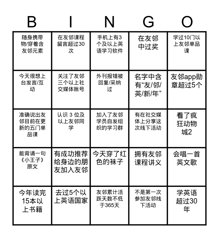 This bingo card has 25 words: 能背诵一句《小王子》原文, 去过5个以上英语国家, 加入了友邻学员自发组织的学习群, 不是第一次参加友邻线下活动, 学过10门以上友邻单品课, 随身携带物/穿着含友邻元素, 在友邻课程留言超过30次, 手机上有3个及以上英语学习软件, 有在社交媒体上分享这次线下活动, 会唱一首英文歌, 今天很想上台发言/互动, 关注了友邻三个以上社交媒体账号, 友邻累计活跃天数不低于365天, 拥有友邻课程讲义, 友邻app勋章超过5个, 今年读完15本以上书籍, 认识 3 位及以上友邻同学, 外刊报错被回复/采纳过, 名字中含有“友/邻/英/新/年”, 看了疯狂动物城2, 准确说出友邻目前在更新的五门单品课, 有成功推荐给身边的朋友加入友邻, 今天穿了红色的袜子, 在友邻中过奖 and 学英语超过30年.