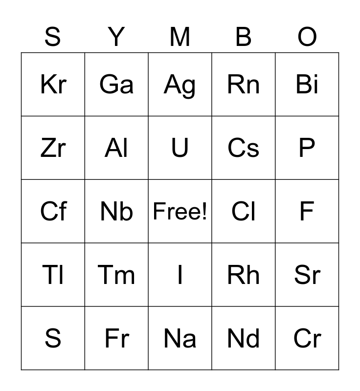 This bingo card has a free space and 79 words: Li, Tc, Ag, Po, He, Mg, Ru, Pb, At, H, O, Y, Rn, Kr, Ca, Zr, Au, Tm, Xe, F, V, Bi, Cf, U, Al, Mo, Co, Rb, Be, C, P, Ne, Na, Si, S, Cl, Ar, Sc, Ti, Cr, Mn, Fe, Ni, Cu, Zn, Ga, Ge, As, Se, Br, Sr, Nb, Rh, Pd, Cd, In, Sn, Sb, Te, I, Cs, Ba, Hf, Ta, W, Re, Os, Ir, Hg, Tl, Fr, Ra, Rf, Db, Ce, Nd, Ts, Mt and Nh.