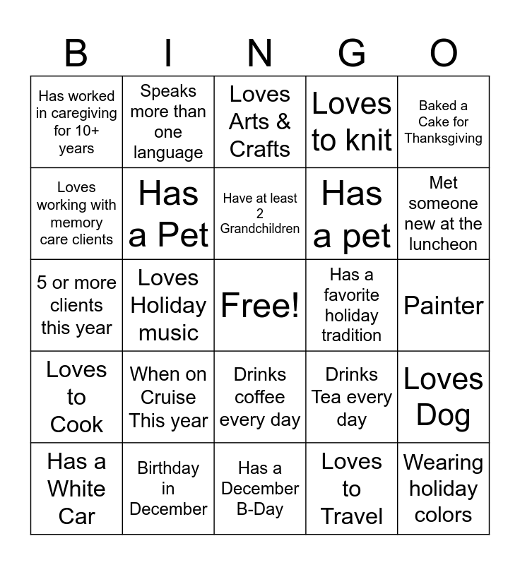 This bingo card has a free space and 24 words: When on Cruise This year, Birthday in December, Have at least 2 Grandchildren, Has a White Car, Baked a Cake for Thanksgiving, Has worked in caregiving for 10+ years, Loves working with memory care clients, Speaks more than one language, Has a favorite holiday tradition, Drinks coffee every day, Has a pet, 5 or more clients this year, Drinks Tea every day, Loves Dog, Has a Pet, Loves to Travel, Painter, Loves Arts & Crafts, Met someone new at the luncheon, Loves Holiday music, Wearing holiday colors, Loves to Cook, Loves to knit and Has a December B-Day.