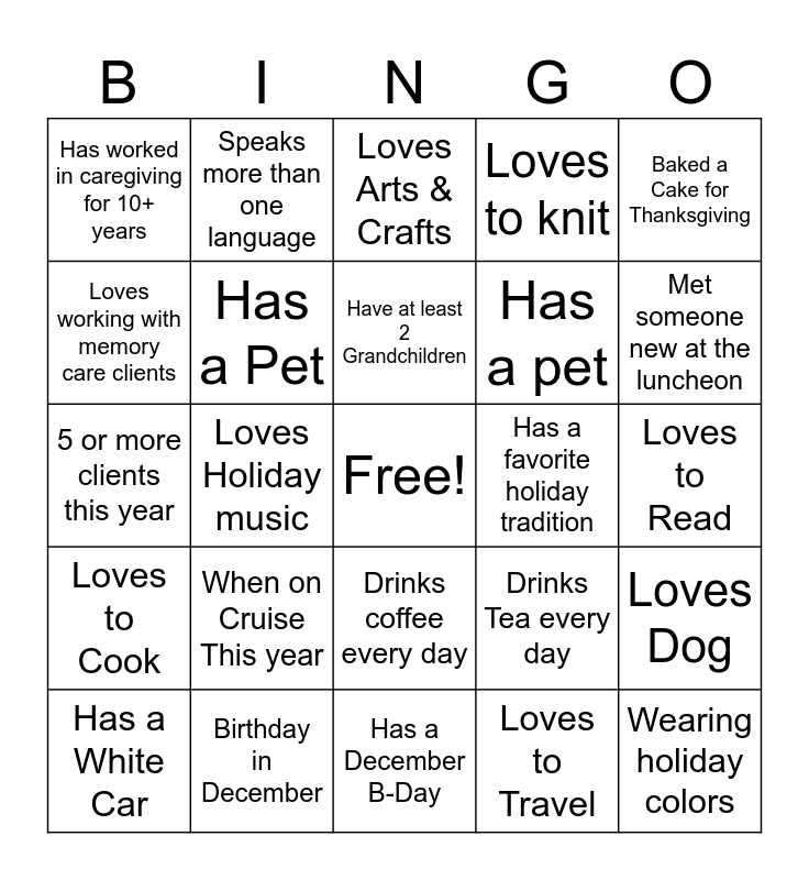 This bingo card has a free space and 24 words: When on Cruise This year, Birthday in December, Have at least 2 Grandchildren, Has a White Car, Baked a Cake for Thanksgiving, Has worked in caregiving for 10+ years, Loves working with memory care clients, Speaks more than one language, Has a favorite holiday tradition, Drinks coffee every day, Has a pet, 5 or more clients this year, Drinks Tea every day, Loves Dog, Has a Pet, Loves to Travel, Loves to Read, Loves Arts & Crafts, Met someone new at the luncheon, Loves Holiday music, Wearing holiday colors, Loves to Cook, Loves to knit and Has a December B-Day.