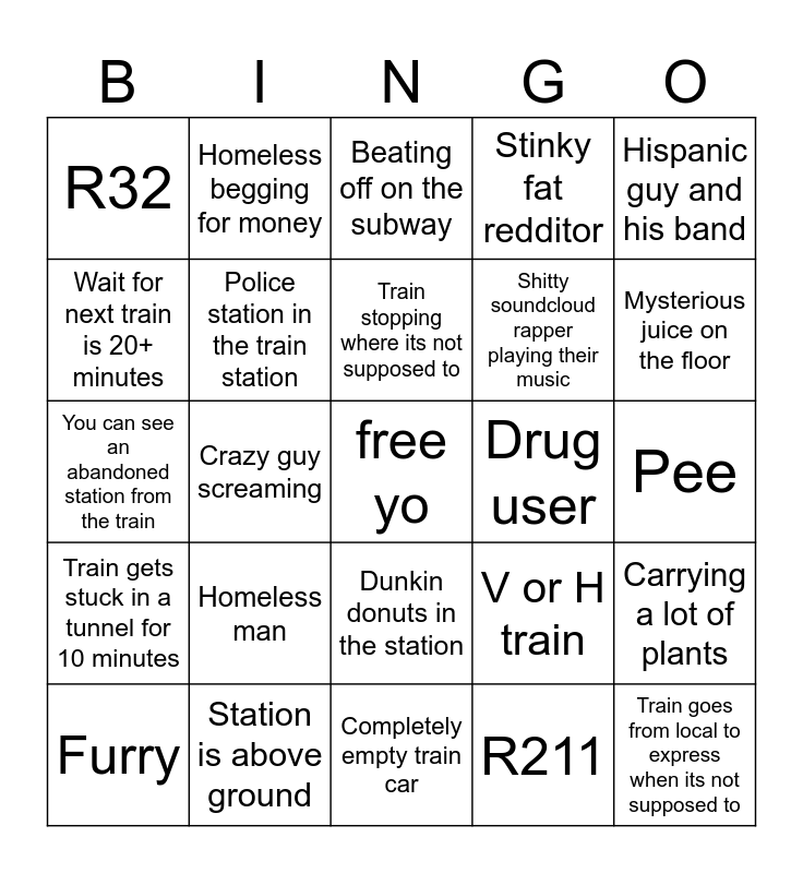 This bingo card has a free space and 24 words: Homeless man, Station is above ground, Train stopping where its not supposed to, Furry, Hispanic guy and his band, R32, Wait for next train is 20+ minutes, Homeless begging for money, Drug user, Dunkin donuts in the station, Shitty soundcloud rapper playing their music, You can see an abandoned station from the train, V or H train, Carrying a lot of plants, Police station in the train station, R211, Pee, Beating off on the subway, Mysterious juice on the floor, Crazy guy screaming, Train goes from local to express when its not supposed to, Train gets stuck in a tunnel for 10 minutes, Stinky fat redditor and Completely empty train car.