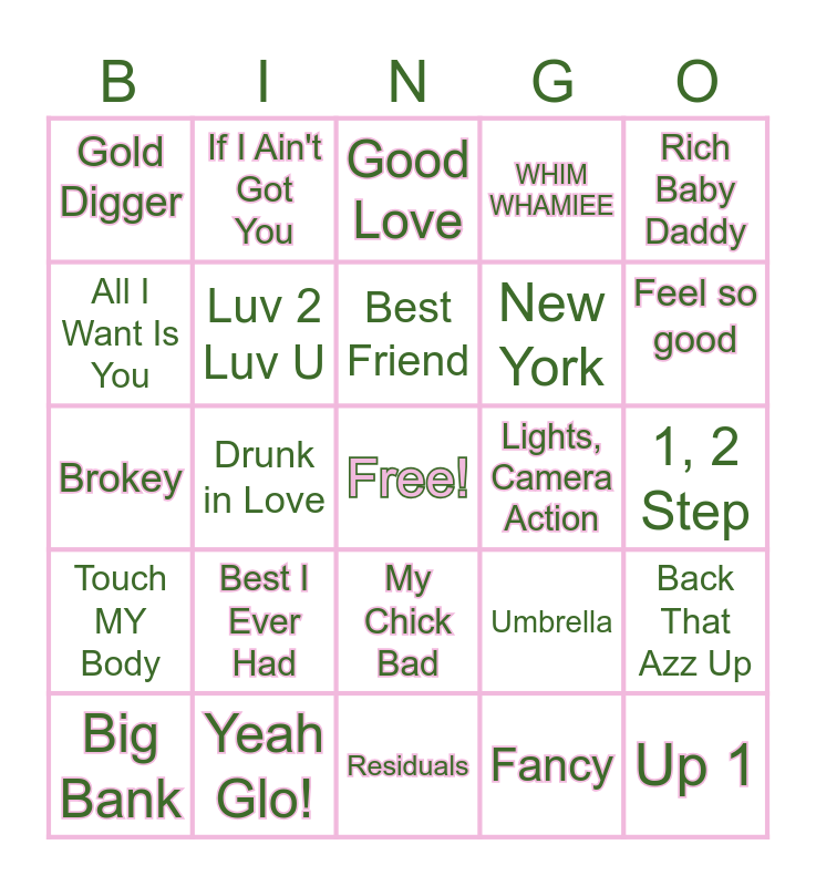 This bingo card has a free space and 45 words: Mrs. Officer Comfortable, Up 1, Pushin P, Big Bank, Ex For A Reason, Fancy, Good Love, Money, Rich Baby Daddy, Yeah Glo!, WHIM WHAMIEE, Lights, Camera Action, My Chick Bad, Best I Ever Had, Lollipop, Residuals, Lean Back (Remix), Brokey, Big Ole Freak, Feel so good, If I Ain't Got You, Family Affair, Candy Shop, Gold Digger, High School, 1, 2 Step, Hot in Here, Jump Off, Umbrella, Touch MY Body, It Wasn’t me, Back That Azz Up, All I Want for Christmas Is You, Love, Money Ain't a Thang, Drunk in Love, Don't Forget About Us, Who Can I Run To?, Never Gonna Get It, Best Friend, All I Want Is You, New York, I'm your baby tonight, Luv 2 Luv U and Water.