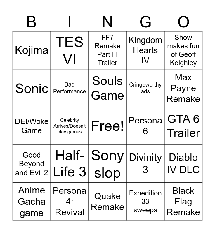 This bingo card has a free space and 24 words: Half-Life 3, Persona 4: Revival, Souls Game, Anime Gacha game, Show makes fun of Geoff Keighley, Kojima, Sonic, TES VI, Persona 6, Sony slop, Cringeworthy ads, DEI/Woke Game, Divinity 3, Diablo IV DLC, Bad Performance, Expedition 33 sweeps, GTA 6 Trailer, FF7 Remake Part III Trailer, Max Payne Remake, Celebrity Arrives/Doesn't play games, Black Flag Remake, Good Beyond and Evil 2, Kingdom Hearts IV and Quake Remake.