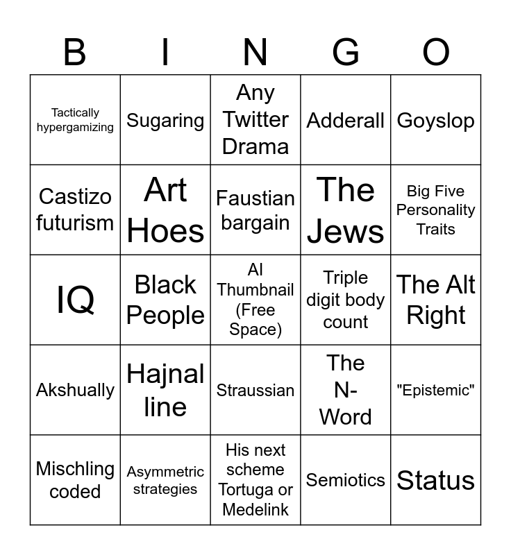 This bingo card has a free space and 24 words: Hajnal line, Asymmetric strategies, Faustian bargain, Mischling coded, Goyslop, Tactically hypergamizing, Castizo futurism, Sugaring, Triple digit body count, Straussian, The Jews, IQ, The N-Word, "Epistemic", Art Hoes, Semiotics, The Alt Right, Any Twitter Drama, Big Five Personality Traits, Black People, Status, Akshually, Adderall and His next scheme Tortuga or Medelink.