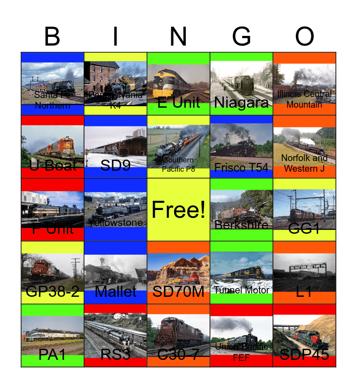 This bingo card has 24 images, a free space and 24 words: Mallet, RS3, Southern Pacific P8, PA1, Illinois Central Mountain, Santa Fe Northern, U Boat, Pennsylvania K4, Berkshire, SD70M, Frisco T54, F Unit, Tunnel Motor, L1, SD9, Union Pacific FEF, GG1, E Unit, Norfolk and Western J, Yellowstone, SDP45, GP38-2, Niagara and C30-7.