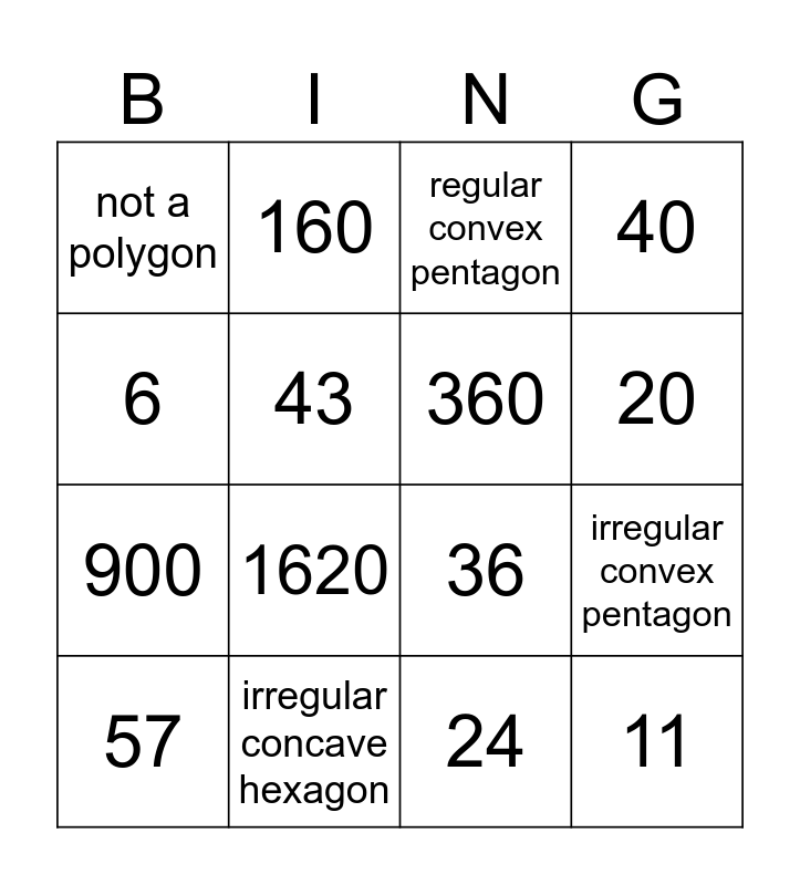 This bingo card has 16 words: irregular concave hexagon, irregular convex pentagon, regular convex pentagon, not a polygon, 900, 160, 36, 24, 6, 43, 57, 40, 1620, 20, 360 and 11.