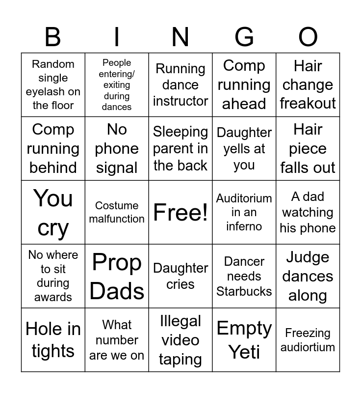 This bingo card has a free space and 24 words: Prop Dads, What number are we on, Sleeping parent in the back, Hole in tights, Hair change freakout, Random single eyelash on the floor, Comp running behind, People entering/ exiting during dances, Auditorium in an inferno, Daughter cries, Daughter yells at you, You cry, Dancer needs Starbucks, Judge dances along, No phone signal, Empty Yeti, A dad watching his phone, Running dance instructor, Hair piece falls out, Costume malfunction, Freezing audiortium, No where to sit during awards, Comp running ahead and Illegal video taping.