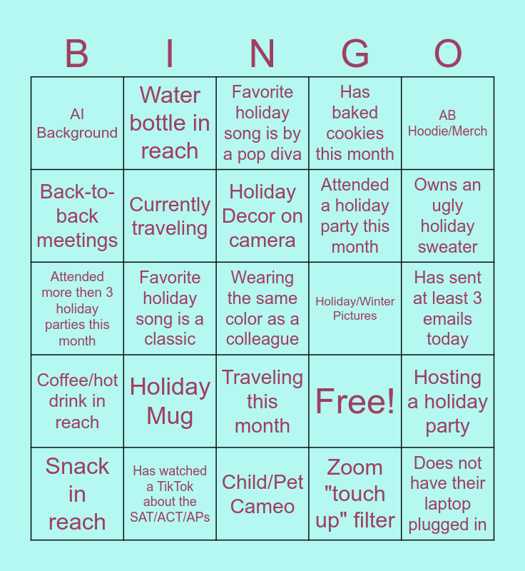 This bingo card has 25 words: Holiday Mug, Child/Pet Cameo, Holiday Decor on camera, Snack in reach, AB Hoodie/Merch, AI Background, Back-to-back meetings, Water bottle in reach, Holiday/Winter Pictures, Traveling this month, Attended a holiday party this month, Attended more then 3 holiday parties this month, Free!, Hosting a holiday party, Currently traveling, Does not have their laptop plugged in, Has sent at least 3 emails today, Favorite holiday song is by a pop diva, Owns an ugly holiday sweater, Favorite holiday song is a classic, Wearing the same color as a colleague, Has watched a TikTok about the SAT/ACT/APs, Coffee/hot drink in reach, Has baked cookies this month and Zoom "touch up" filter.