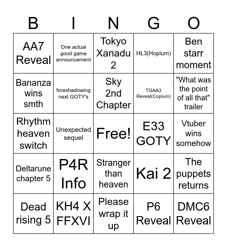 This bingo card has a free space and 24 words: P4R Info, KH4 X FFXVI, Sky 2nd Chapter, Dead rising 5, Ben starr moment, AA7 Reveal, Bananza wins smth, One actual good game announcement, E33 GOTY, Stranger than heaven, TGAA3 Reveal(Copium), Rhythm heaven switch, Kai 2, The puppets returns, foreshadowing next GOTY's, P6 Reveal, Vtuber wins somehow, Tokyo Xanadu 2, "What was the point of all that" trailer, Unexpected sequel, DMC6 Reveal, Deltarune chapter 5, HL3(Hopium) and Please wrap it up.