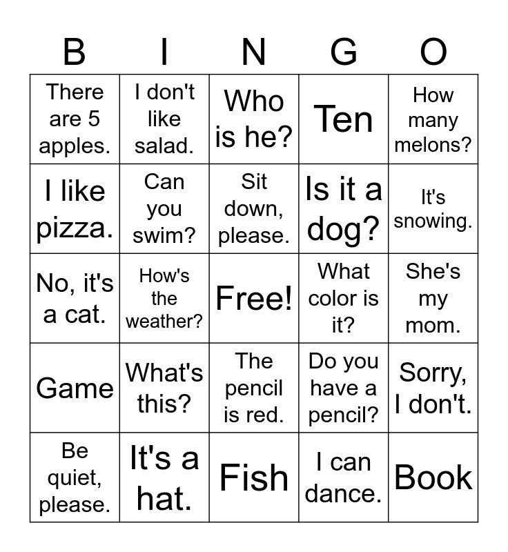 This bingo card has a free space and 24 words: What's this?, It's a hat., Sit down, please., Be quiet, please., How many melons?, There are 5 apples., I like pizza., I don't like salad., What color is it?, The pencil is red., Is it a dog?, No, it's a cat., Do you have a pencil?, Sorry, I don't., Can you swim?, I can dance., She's my mom., Who is he?, It's snowing., How's the weather?, Book, Game, Ten and Fish.