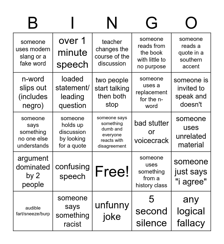 This bingo card has 26 words: Free!, 5 second silence, two people start talking then both stop, someone says something racist, someone reads a quote in a southern accent, someone uses modern slang or a fake word, n-word slips out (includes negro), over 1 minute speech, someone uses unrelated material, someone uses something from a history class, someone uses a replacement for the n-word, someone says something no one else understands, someone just says "i agree", audible fart/sneeze/burp, someone holds up discussion by looking for a quote, someone repeats something someone else just said, someone reads from the book with little to no purpose, argument dominated by 2 people, teacher changes the course of the discussion, someone says something dumb and everyone reacts with disagreement, someone is invited to speak and doesn't, unfunny joke, bad stutter or voicecrack, confusing speech, loaded statement/ leading question and any logical fallacy.