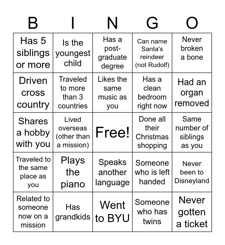 This bingo card has a free space and 24 words: Plays the piano, Has grandkids, Likes the same music as you, Related to someone now on a mission, Never broken a bone, Has 5 siblings or more, Driven cross country, Is the youngest child, Done all their Christmas shopping, Speaks another language, Has a clean bedroom right now, Shares a hobby with you, Someone who is left handed, Never been to Disneyland, Traveled to more than 3 countries, Someone who has twins, Same number of siblings as you, Has a post-graduate degree, Had an organ removed, Lived overseas (other than a mission), Never gotten a ticket, Traveled to the same place as you, Can name Santa's reindeer (not Rudolf) and Went to BYU.