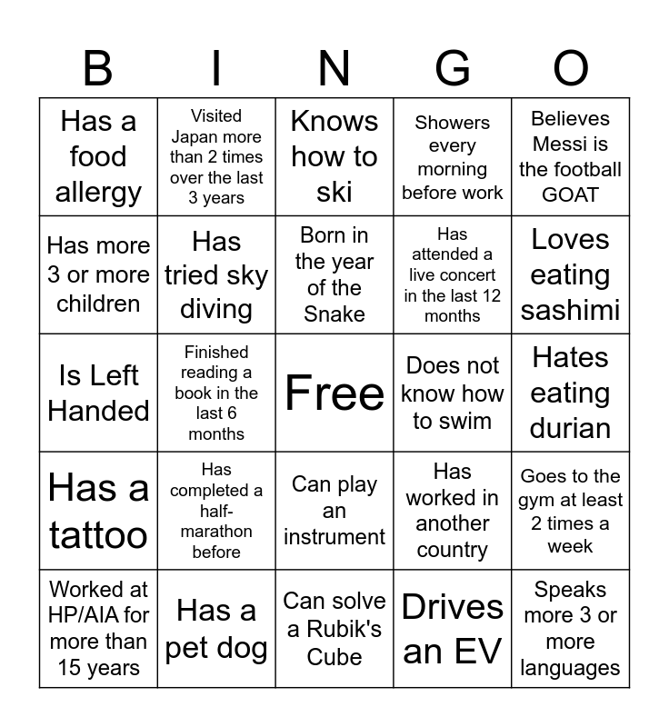 This bingo card has a free space and 24 words: Has completed a half-marathon before, Has a pet dog, Born in the year of the Snake, Worked at HP/AIA for more than 15 years, Believes Messi is the football GOAT, Has a food allergy, Has more 3 or more children, Visited Japan more than 2 times over the last 3 years, Does not know how to swim, Can play an instrument, Has attended a live concert in the last 12 months, Is Left Handed, Has worked in another country, Goes to the gym at least 2 times a week, Has tried sky diving, Drives an EV, Hates eating durian, Knows how to ski, Loves eating sashimi, Finished reading a book in the last 6 months, Speaks more 3 or more languages, Has a tattoo, Showers every morning before work and Can solve a Rubik's Cube.