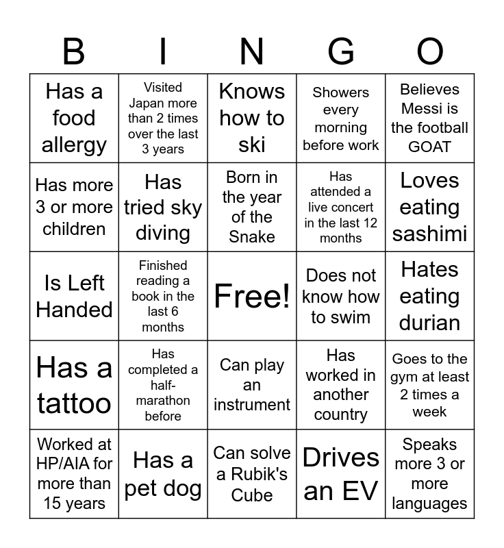 This bingo card has a free space and 24 words: Has completed a half-marathon before, Has a pet dog, Born in the year of the Snake, Worked at HP/AIA for more than 15 years, Believes Messi is the football GOAT, Has a food allergy, Has more 3 or more children, Visited Japan more than 2 times over the last 3 years, Does not know how to swim, Can play an instrument, Has attended a live concert in the last 12 months, Is Left Handed, Has worked in another country, Goes to the gym at least 2 times a week, Has tried sky diving, Drives an EV, Hates eating durian, Knows how to ski, Loves eating sashimi, Finished reading a book in the last 6 months, Speaks more 3 or more languages, Has a tattoo, Showers every morning before work and Can solve a Rubik's Cube.