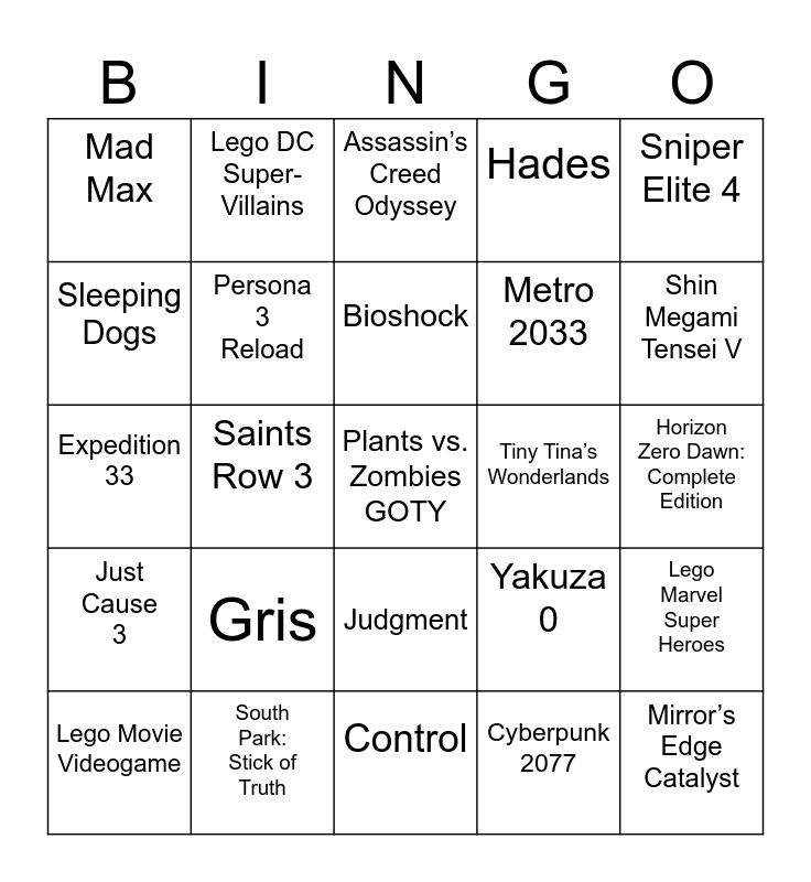 This bingo card has a free space and 24 words: Gris, South Park: Stick of Truth, Bioshock, Lego Movie Videogame, Sniper Elite 4, Mad Max, Sleeping Dogs, Lego DC Super-Villains, Tiny Tina’s Wonderlands, Judgment, Metro 2033, Expedition 33, Yakuza 0, Lego Marvel Super Heroes, Persona 3 Reload, Cyberpunk 2077, Horizon Zero Dawn: Complete Edition, Assassin’s Creed Odyssey, Shin Megami Tensei V, Saints Row 3, Mirror’s Edge Catalyst, Just Cause 3, Hades and Control.